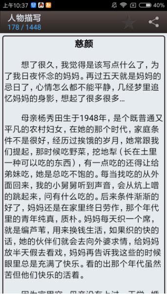 素材是写作的基础。很多同学在写作时常常感到无话可说,要么生搬硬套,要么东拼西凑。这款应用精选了上千篇优质范文,涵盖人物、事件、景物等各类题材,让您轻松积累写作素材,真正做到"读书破万卷,下笔如有神"。
