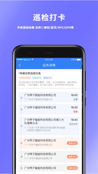"巡查蝠"智慧巡检系统由甲子智能公司研发,有效监督巡检人员工作情况,避免漏检情况发生,及时发现并解决隐患问题,保障企业财产安全,适用于保安巡逻、设备巡视、管线检查等。它简单易用、高效便捷,管理人员通过"巡查蝠"系统可监督巡查人员的工作状态,并对日常巡检、设备设施运维、异常情况进行统筹管理。