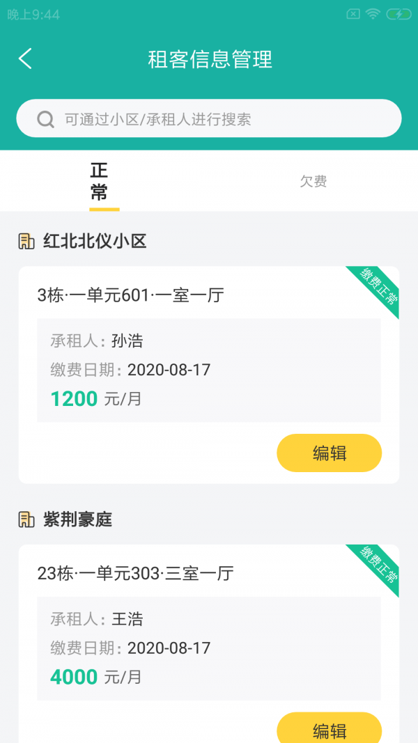 租户信息:维护租户档案,支持身份证上传、电话联系等功能
