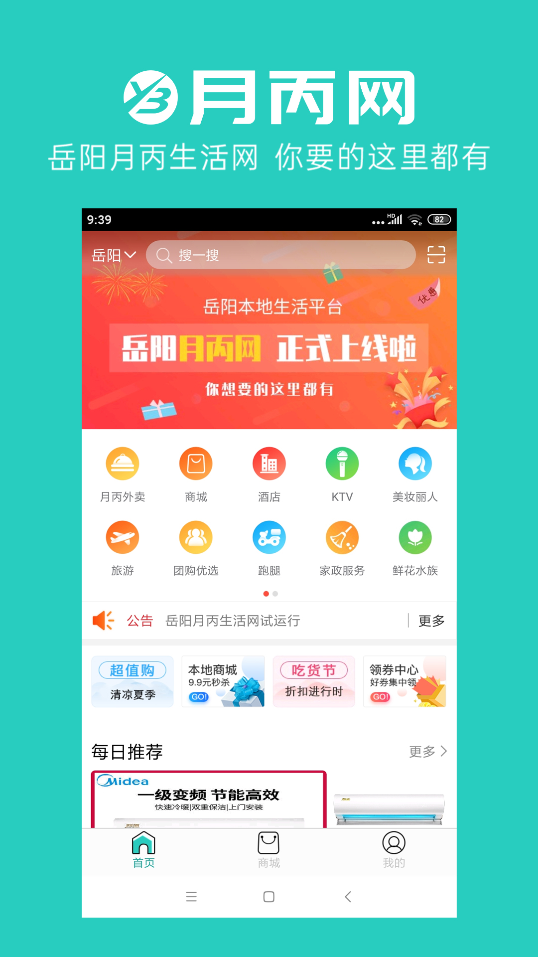 岳阳月丙生活网是一款立足岳阳本地的综合性服务平台,以资讯为核心,整合了团购优惠、美食推荐和电商服务等多元化内容。