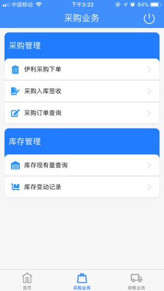 包括采购管理和库存管理。采购管理又分为伊利采购下单、自营产品下单、采购入库签收、采购订单查询几个功能模块。库存管理可查询现有的库存量和库存变动记录