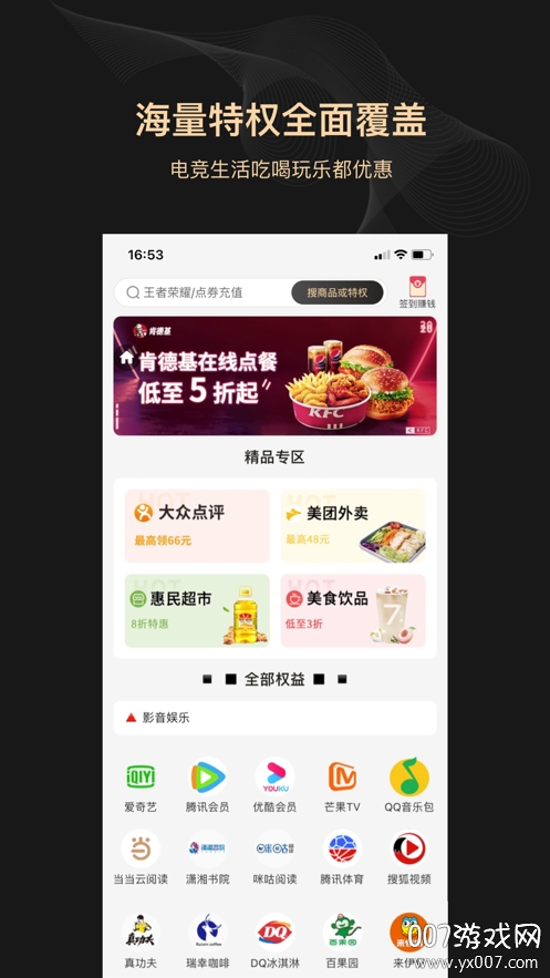 【尊享特权】汇聚上百项品牌优惠,包括爱奇艺、腾讯、优酷等视频会员折扣,网易云音乐、QQ音乐等娱乐会员特惠,以及星巴克、肯德基、瑞幸等餐饮优惠卡券。