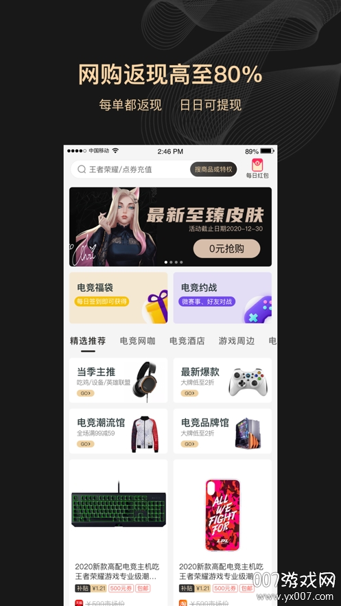 【电竞专区】提供游戏充值5折起的超值优惠,电竞外设及周边产品享受补贴+返现双重福利,更有0元购、网咖酒店返现、1元购赛事门票等惊喜活动,助你畅享电竞生活。