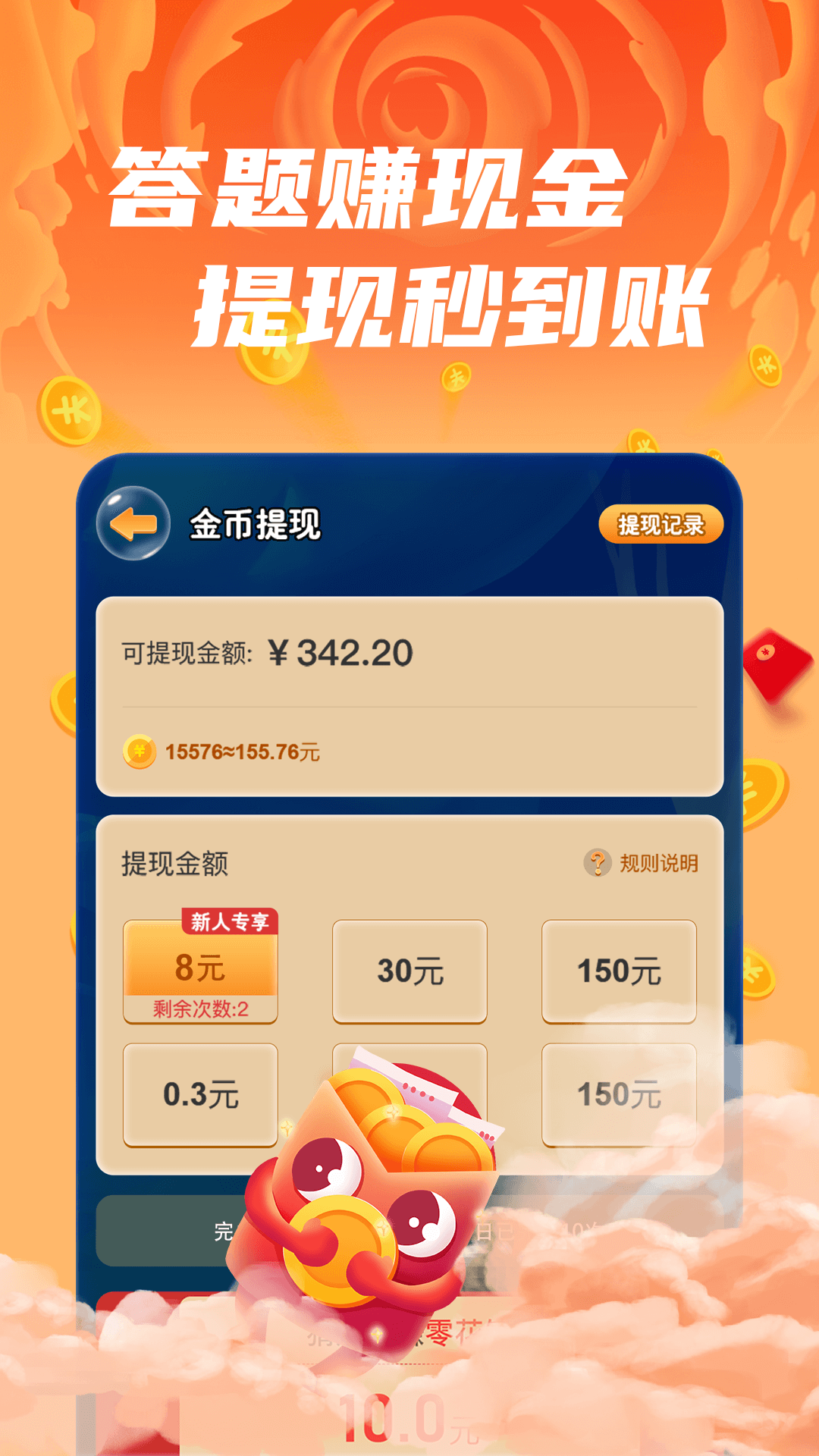 答对有趣的成语后收到红包的平台奖励丰富,可换成新的红包完成。