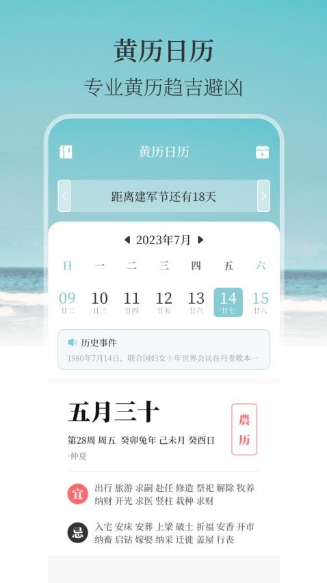 集成农历日期、节日提醒、记事功能,还能记录重要行程和历史事件。