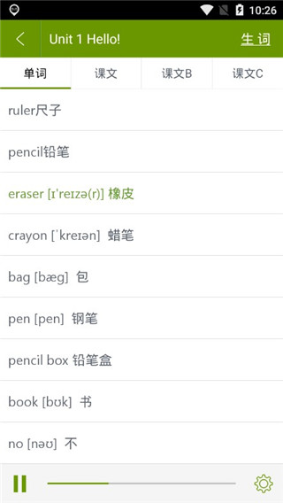包含多版本英语教材,不管你使用的是何种教材,都可以在软件内获取到相应的电子学习教材;有着高效、实用的点读功能,成为学生的掌上学习机,随时都可以移动学习配套的教材知识;