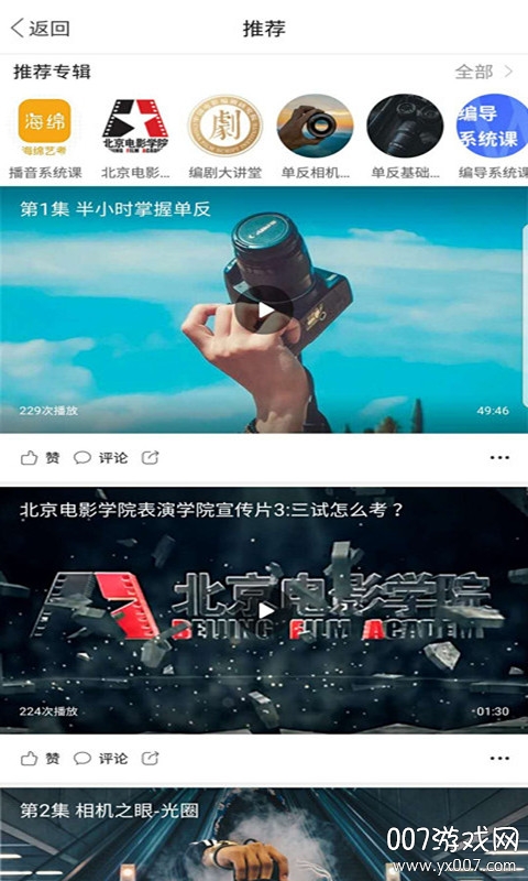 自学宝典、院校简章、视频课程、播音、表演、编导、等补个不同类别的圈子。