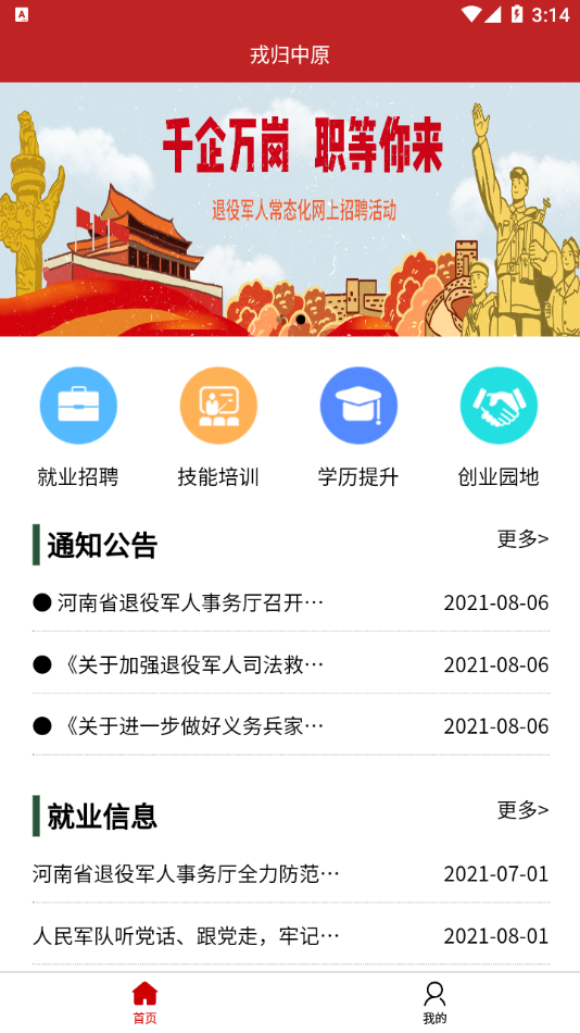 “戎归中原”APP与平台网站端的功能相同,就业招聘、技能培训、学历提升、创业园地等模块一应俱全,退役军人在APP首页便可使用所有功能;