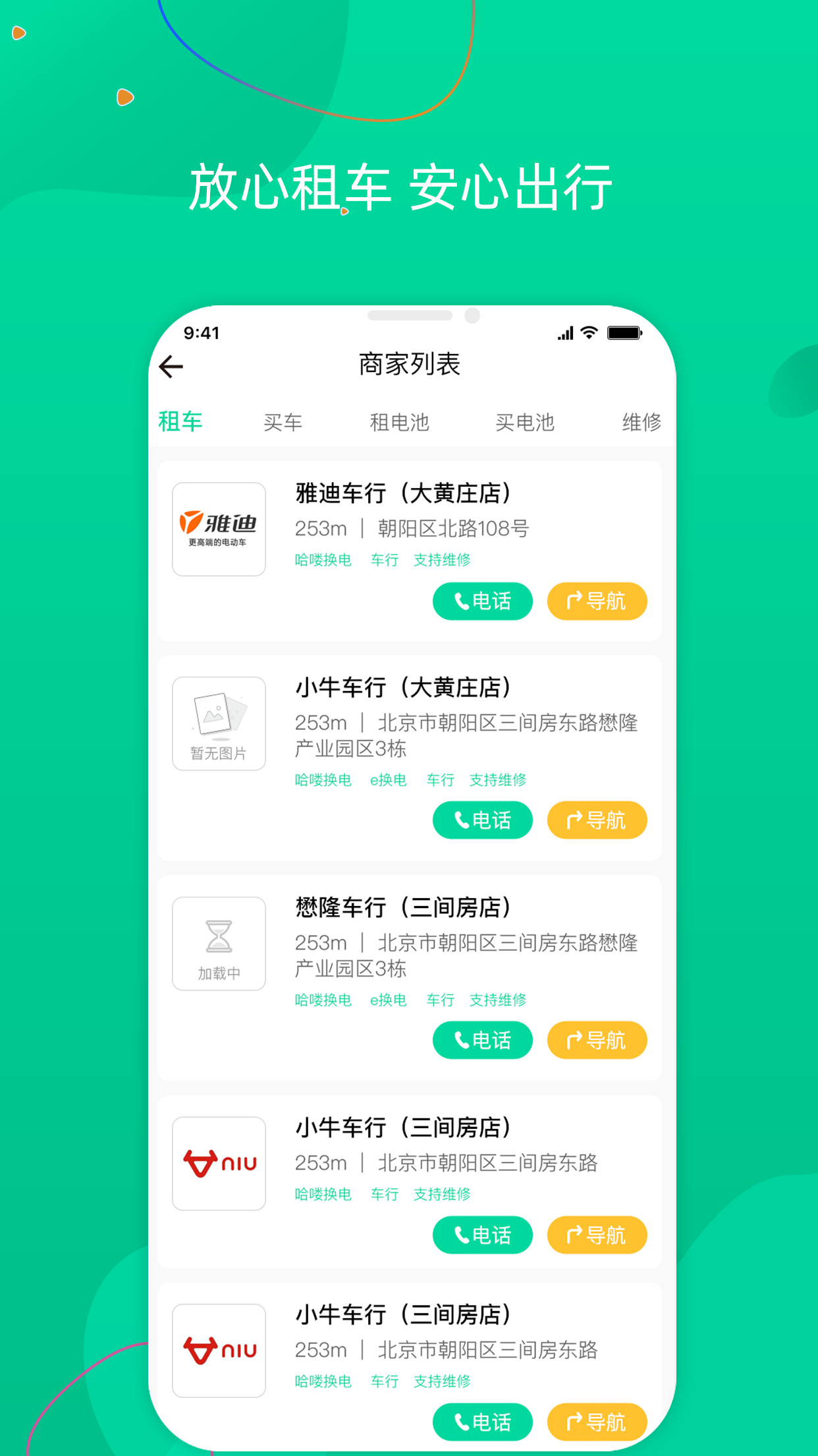 一键查看附近商家,享受更贴心的电动车、电池的租赁、购买服务。