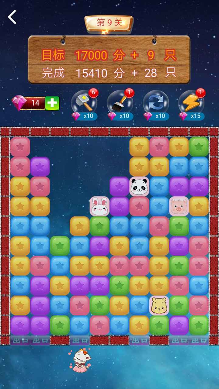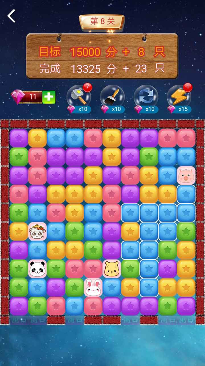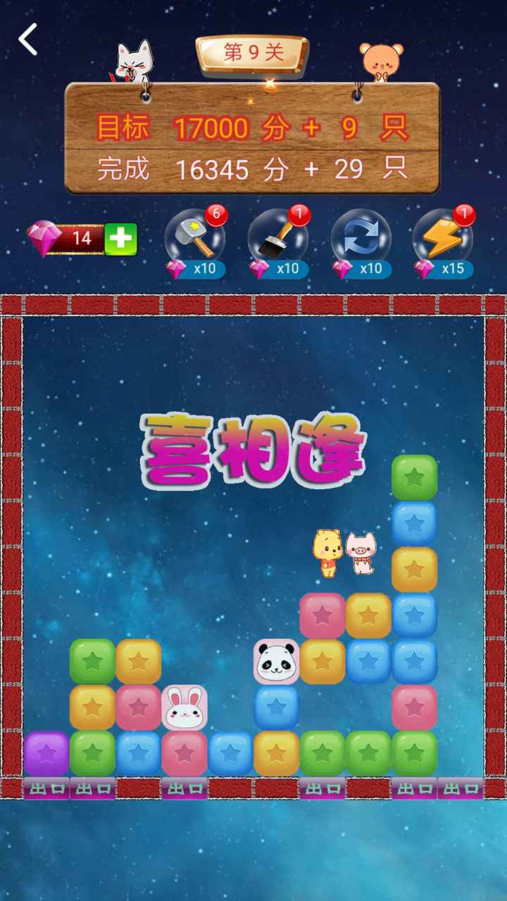 游戏的核心玩法是点击两个或以上相连的同色方块进行消除。玩家需要巧妙规划消除路线,让萌宠方块顺利到达城墙底部出口,或者让两个萌宠方块相遇。每个关卡都设置了双重目标:既要达到指定分数,又要成功解救足够数量的萌宠。游戏提供了"锤子"、"刷子"、"重置"、"闪电"四种实用道具,在关键时刻能帮助玩家突破难关。