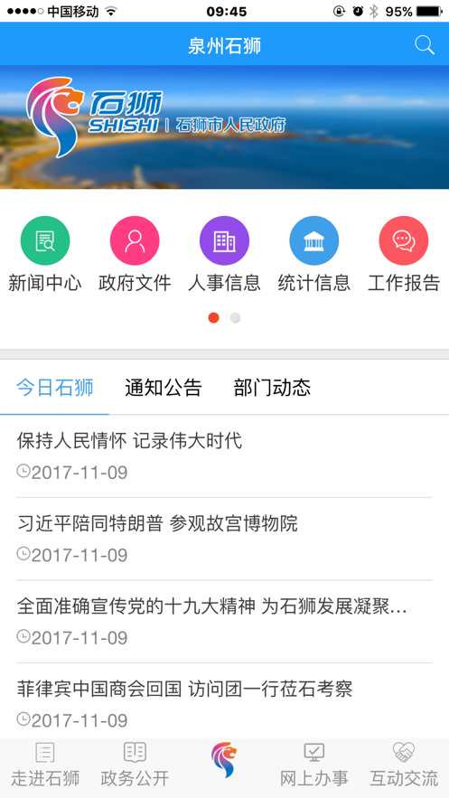 泉州石狮移动客户端现开通走进石狮、政务公开、网上办事、互动交流、今日石狮等栏目,发布石狮市人民政府决策部署和重要政策文件、市政府领导同志重要、考察、出访活动等权威政务信息,建设基于新媒体的政府与公众互动交流新渠道。