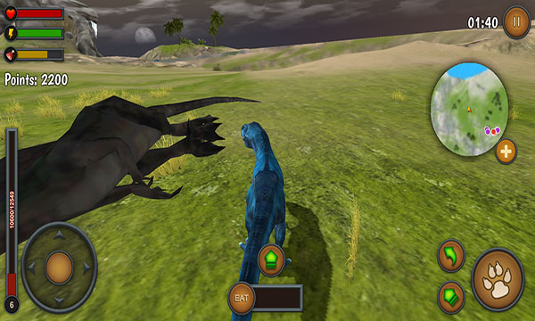 使用虚拟摇杆控制你的霸王龙移动,右侧的地图可以查看你周围的恐龙。