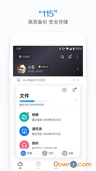 115——为用户提供安全稳定、高效智能的云存储服务,便捷的记录模式,支持相册、通讯录一键备份,海量空间轻松存储一生数据,并可直接在手机端远程管理各端口的设备登录情况,安心又省心。