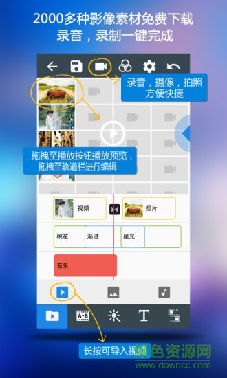内置2000+优质影像素材库,支持一键录音和视频录制