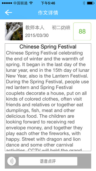 教师端是一款专为英语写作教学设计的移动应用,能够实现作文的在线批改与反馈。当学生提交英语作文后,系统会在1.2秒内完成自动评分,并提供详细的批改建议,包括语法纠错、词汇优化等。教师可随时进行人工复核,学生也能根据反馈反复修改。软件内置丰富的范文资源,满足各类写作需求。
