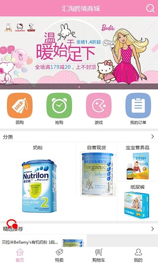 汇淘跨境商城是国内专业的母婴用品电商平台,专注于为年轻父母提供优质进口母婴商品。平台汇聚全球20多个国家的知名品牌,涵盖奶粉、纸尿裤、婴儿辅食等全品类母婴用品,通过特卖模式为用户带来高性价比的跨境购物体验。