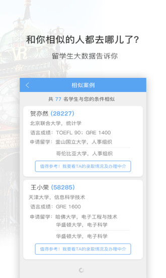 留学定位:基于同背景申请者的大数据轨迹,智能生成选校参考方案
