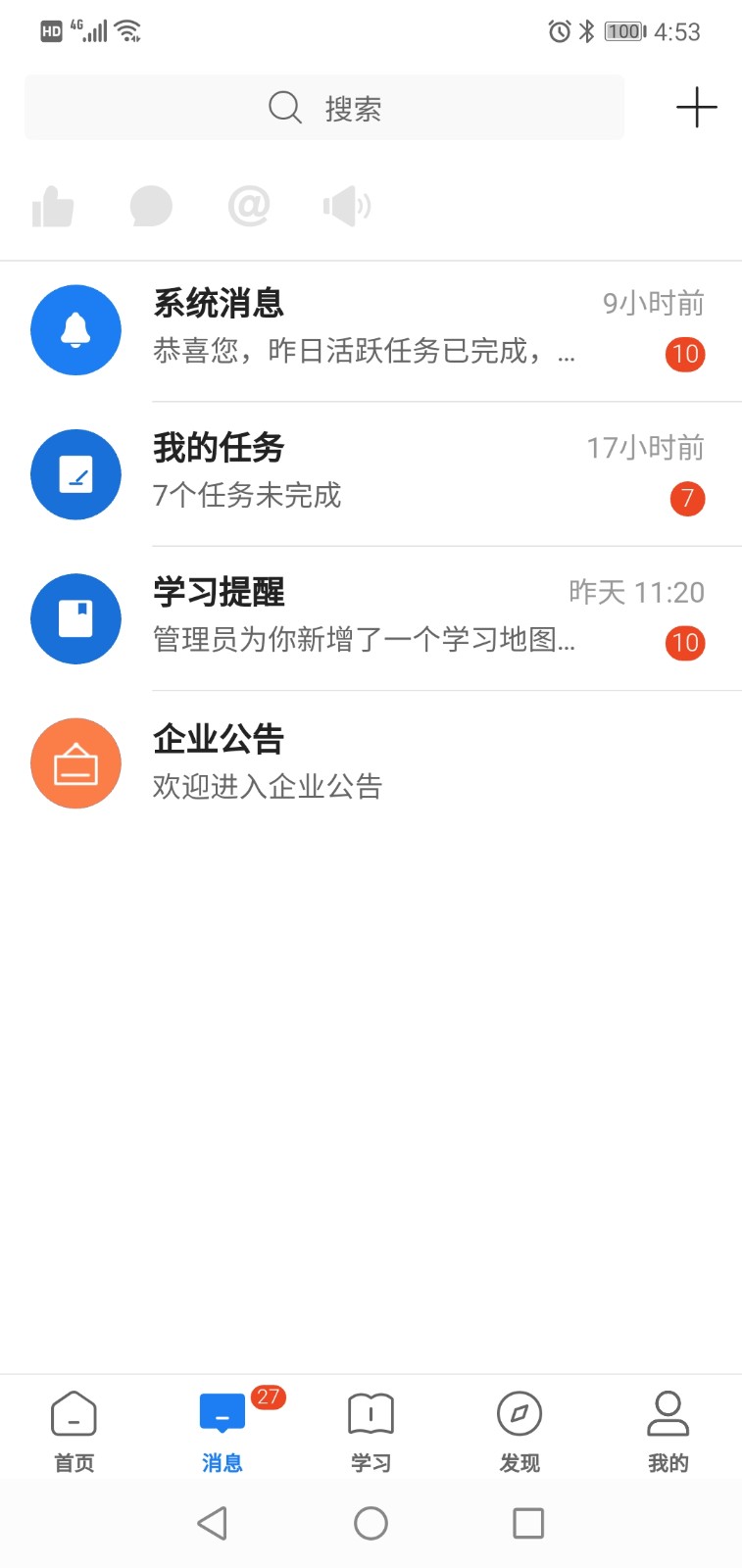 智能消息提醒系统,分类管理学习提醒、企业公告等重要信息。