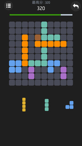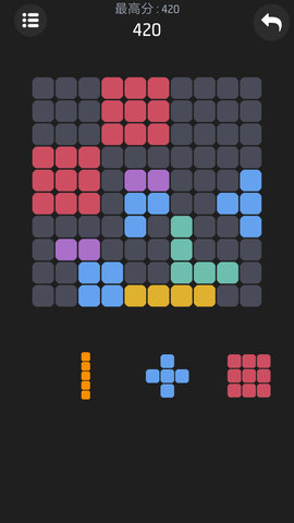 拖动模式:将备选方块拖放至合适位置,组成完整的行或列即可消除得分。当棋盘空间不足时,游戏宣告结束;