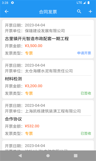 在“发票列表”页面中查看已申请开票的工程项目与对应金额信息。