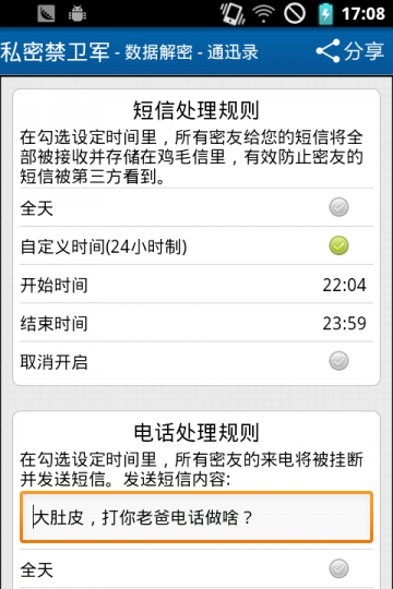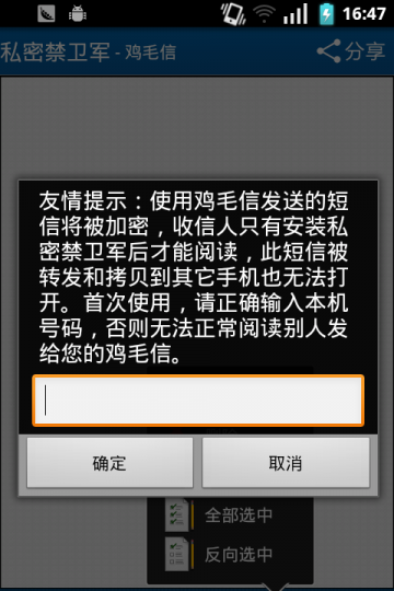 鸡毛信:鸡毛信是发件人把短信内容加密后,以密文的方式发给收件人,不经过许可是无法看到短信内容,如果收件人把鸡毛信转发第三方(尽管第三方也安装了私密禁卫军)或者拷贝出来也无法正常阅读,彻底做到您的短信,只能在指定机器上正常查看,有效地防止您的私密短信的被泄露。