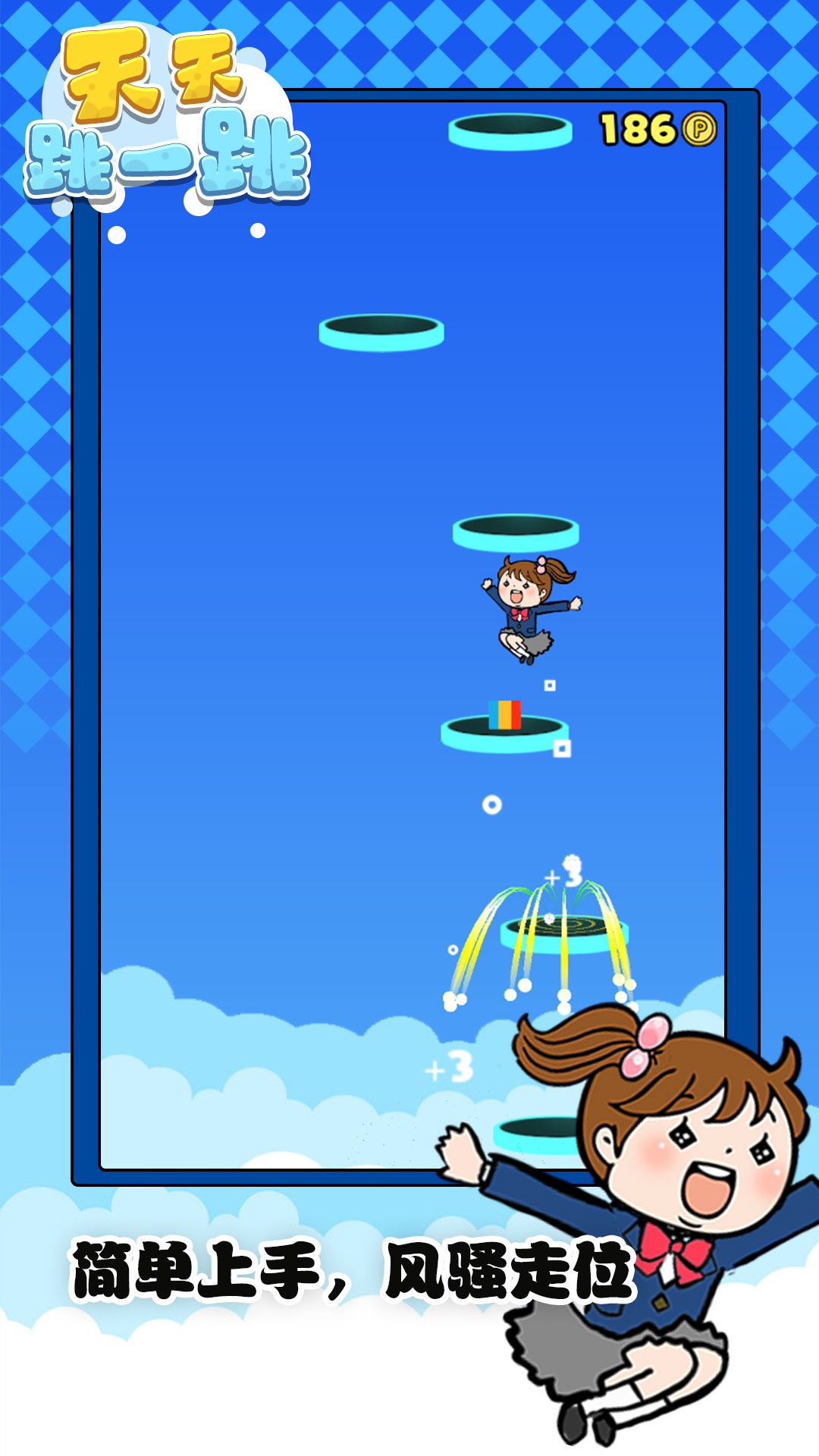 天天跳一跳是一款轻松有趣的休闲小游戏。在游戏中,玩家将操控可爱的小女孩不断向上跳跃,挑战自己的极限高度。丰富多样的趣味关卡设计,让你随时随地都能享受跳跃的乐趣,快来体验这款让人欲罢不能的小游戏吧。