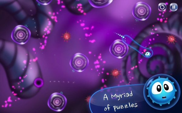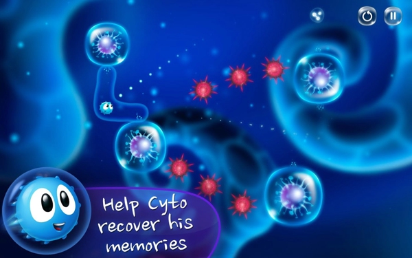 前面提到了本作在玩法上跟《愤怒的小鸟AngryBirds》有些许类似,不过又存在差异。同样是利用弹射玩法,但两者的结果不同,怒鸟们是要借此方法击倒对方阵营;而我们的细胞君Cyto则可以获取物品(记忆碎片),成功地黏着在大型细胞表面的触须上,继而跨越多个平台,最终达到目的地。游戏本身的玩法很丰富,而且充分了利用细胞的特性。比如,轻敲细胞,它的触须收缩,细胞君则会掉落下去,这一招很管用哦!你甚至还可以将Cyto拉到两个细胞之间,形成一个大角度的弹射范围。总之,游戏在玩法上有很多奇思妙想,成功地为大家展现了一个奇妙的细胞世界。