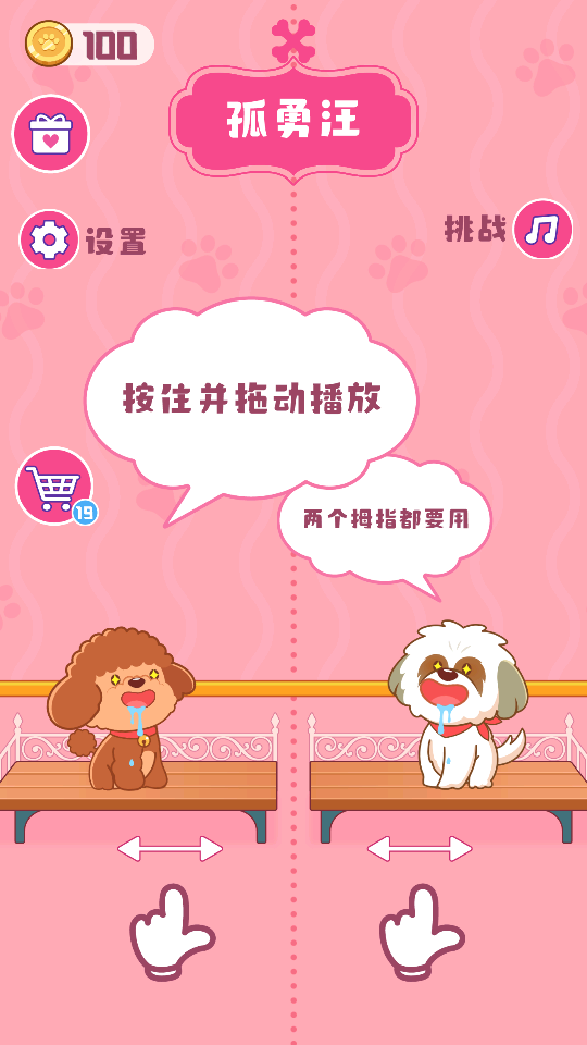 《贪吃汪星人》是一款指尖音乐节奏游戏,在游戏中,玩家可以选择自己喜欢的热门歌曲搭配魔性猫咪喵喵声的混音节奏音乐,精心挑选并购买自己喜欢的宠物狗狗类型和狗狗喜欢的食物,跟随音乐节奏给可爱的小狗喂食。每首音乐都有其独特的节奏和速度,玩家需要双手同时按下屏幕上的双箭头按钮,就可以开始游戏啦!通过移动左右方向来控制汪星人的行动,双手并用,让两只汪汪在正确的时间和位置内吃到更多好吃的食物。注意一定要手疾眼快,不要让食物滑落下去,这样狗狗就会挨饿呦!