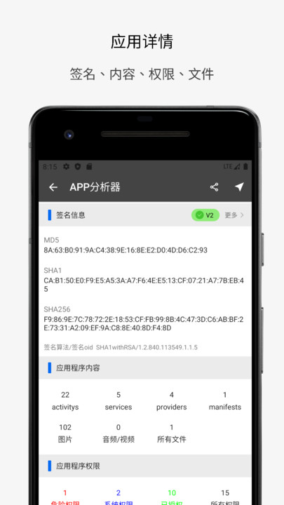 支持以下信息查看:apk信息、app信息、应用包名查看、安装日期、升级日期、占用空间、版本号、安装位置、应用使用统计信息、前台后台服务、服务、应用权限查看、应用权限管理、硬件要求查询、APK资源搜索、证书签名的md5、进程名、UID、签名信息详细查询等。