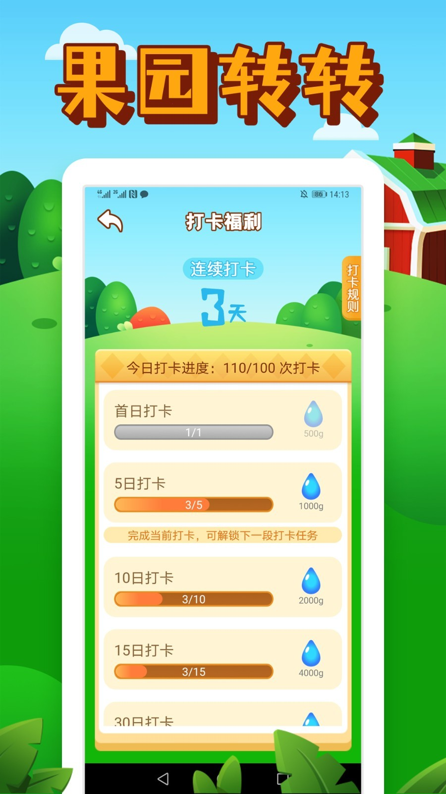 种树的过程真的相当欢乐,完成果园转转游戏的每日任务,获取额外水滴加速果树养成;