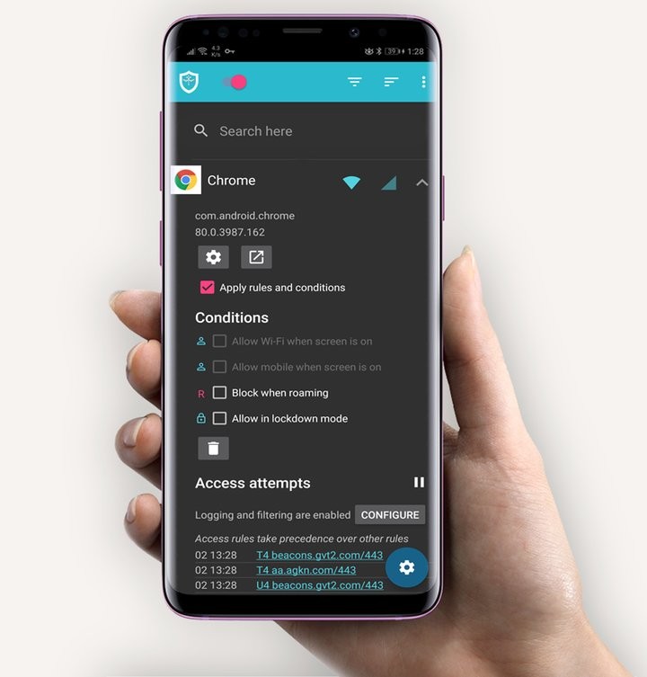 这款工具提供了细粒度的网络访问控制,让用户能够精准管理每个应用和域名的Wi-Fi及移动数据访问权限。