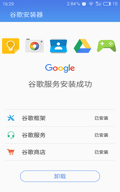 点击一键安装按钮后,系统会自动下载并安装Google服务框架、GooglePlay服务和GooglePlay商店三个核心组件;