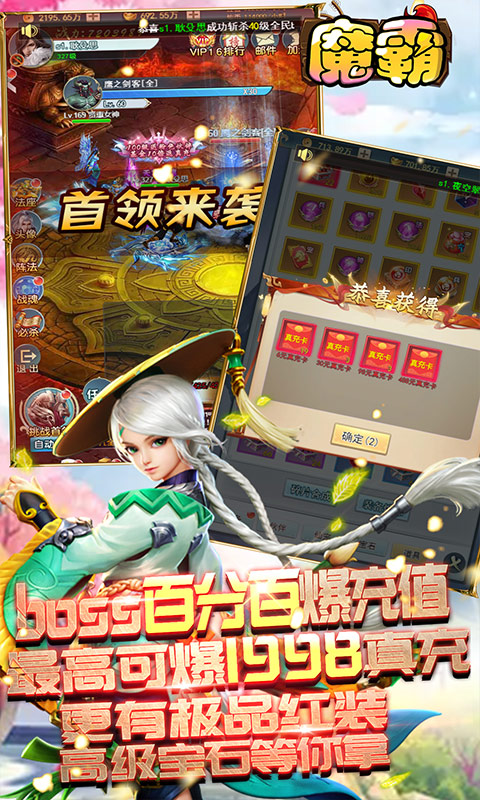 ★击杀boss百分百爆充值,最高可爆1998真充,极品红装、高级宝石等你来拿!