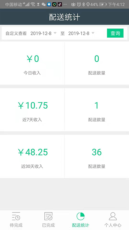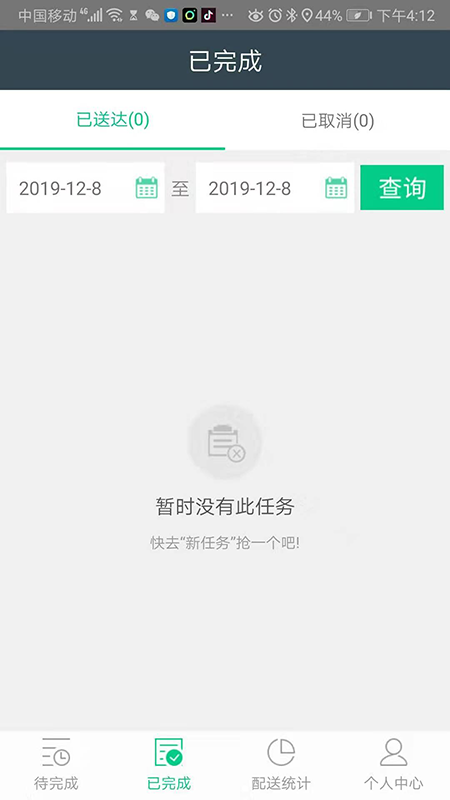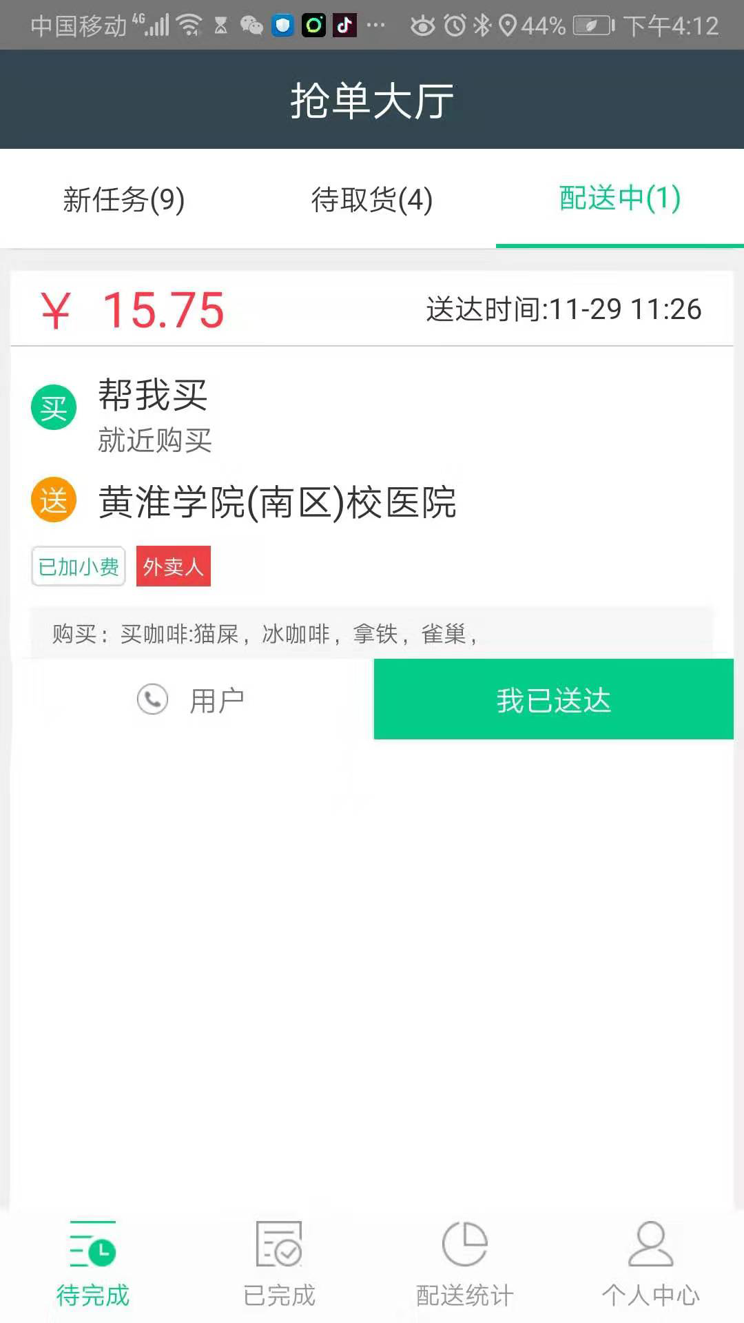用户可在"待完成"中,查看新任务,待取货订单,配送订单等,及时了解订单的进度。
