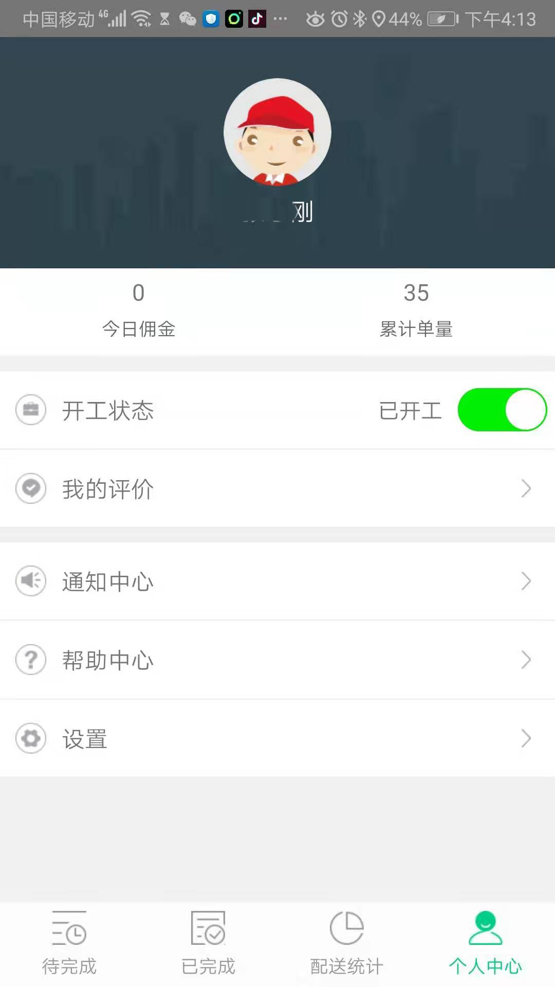 用户可在此查看累计的订单数量、开工状态、我的评价、通知中心、帮助中心、设置等信息。