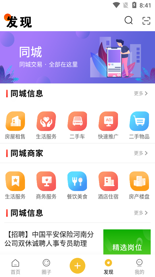 提供每日签到、同城商家推荐、社群互动、房产资讯、热门短视频等丰富功能。