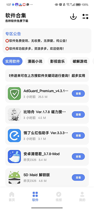 轩哥软件网盘APP是一款资源聚合应用,集成了海量免费工具软件及原创应用。用户无需复杂操作即可直接使用各类资源,突破传统下载限制,实现即开即用的高效体验。