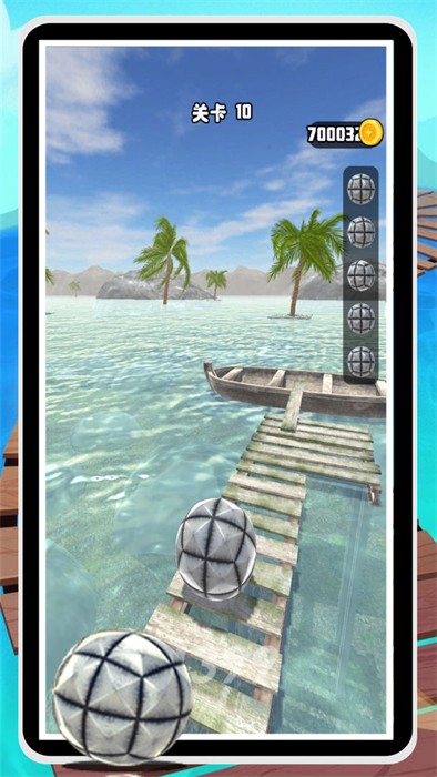 游戏场景设定在水上栈道,玩家必须时刻保持警惕防止球体落水;部分狭窄路段需要精准控制球速才能安全通过;多样化的地形设计包括坡道、下坡等特殊关卡,考验玩家对球体轨迹的掌控能力。