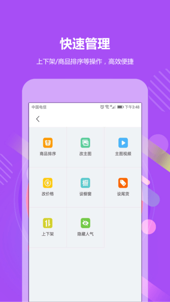 快速对商品进行管理,包括上下架、设橱窗、设尾货