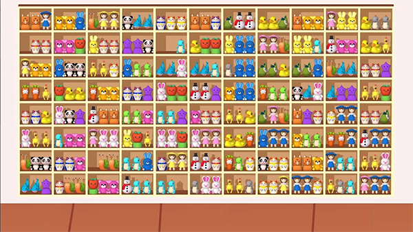 货架上摆放着红彤彤的苹果、慢悠悠的蜗牛、憨态可掬的企鹅,还有呆萌的小熊玩偶,等待你来发现。