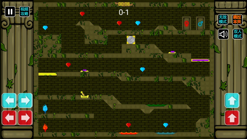 不同颜色的只能相应颜色的宝石(两个角色都可收集绿宝石)以及进入相应颜色的门。
