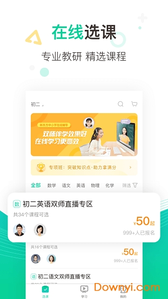 覆盖中小学全科课程,包含小学、初中、高中的数学、语文、英语、物理、化学、生物等学科,通过双师直播教学,完美还原线下学习场景,为学生提供个性化、陪伴式、智能化的在线学习产品及服务,让孩子学习更简单。