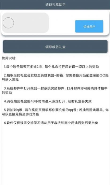 峡谷礼盒助手是一款实用便捷的游戏福利领取工具,用户只需登录熟悉的账号即可轻松操作,软件体积小巧且无任何使用限制,安全稳定运行,为玩家带来丰富的游戏体验,快来加入吧!