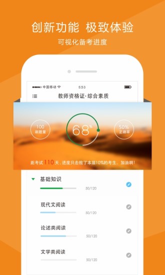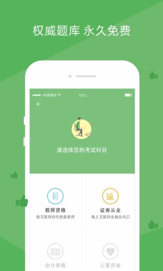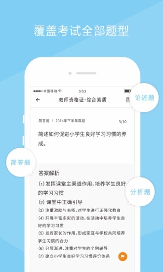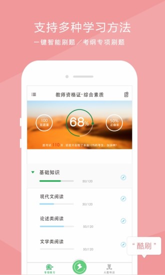 职业考试第一助手。帮助考生对教师资格证等考试进行快速复习通关。通过互联网思维、参与式设计、迭代微创新打造超一流精品。目前已上线"教师资格证""选择题""主观题""考纲知识树""快速智能练习""备考进度"等考试和功能。