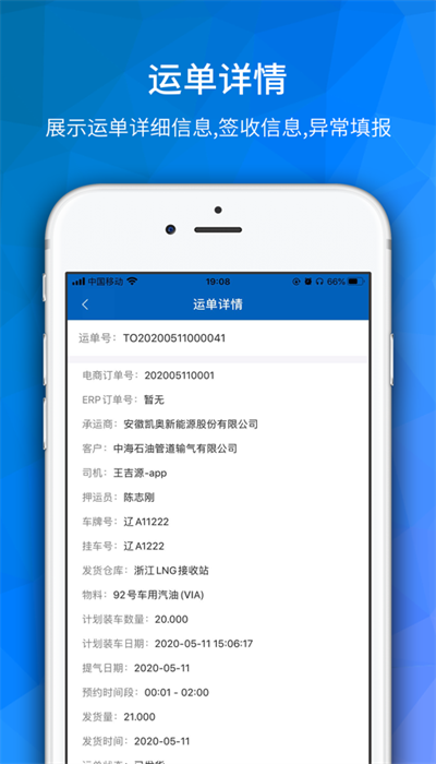 完整呈现运单详情、登录信息,并支持异常情况上报;