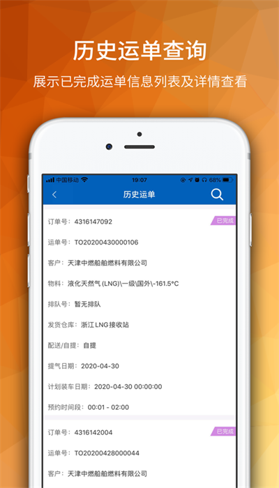 提供已完成运单的查询功能,支持信息列表和详情查看