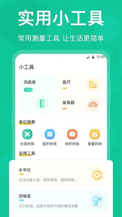 小工具:提供噪音测试、高度测量,水平仪,量角器等实用小工具,为用户的生活提供更多便利。