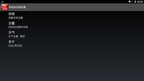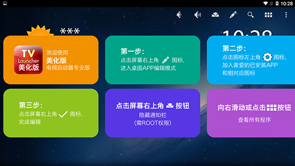 主界面支持6个常用应用快捷入口;实时天气信息显示;应用隐藏功能;状态栏隐藏[需ROOT权限];10款精美壁纸可选;完美适配遥控器操作;内置数字时钟和日期组件;3种时钟风格可选;5种日期格式可调。TV版安装方法