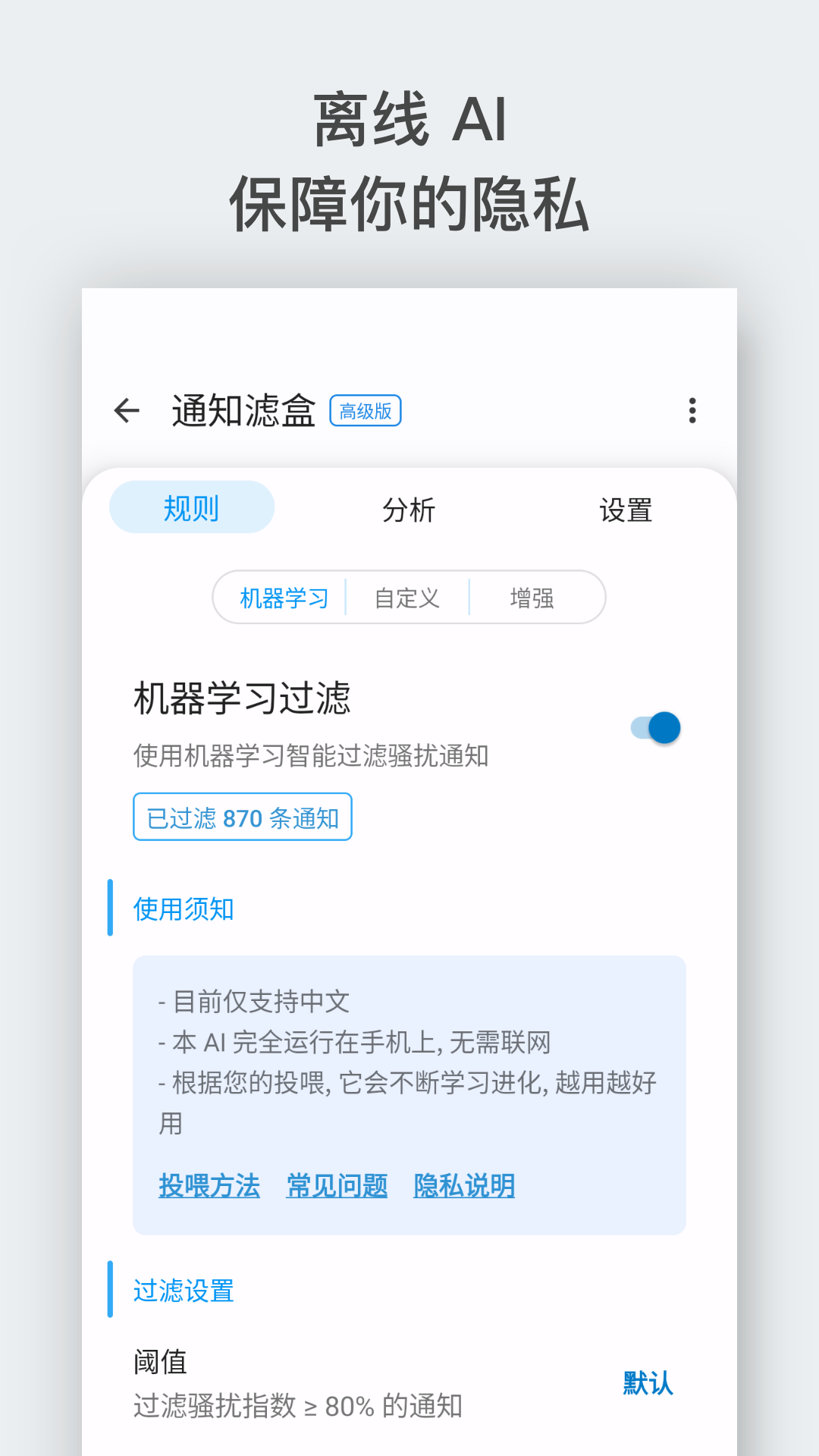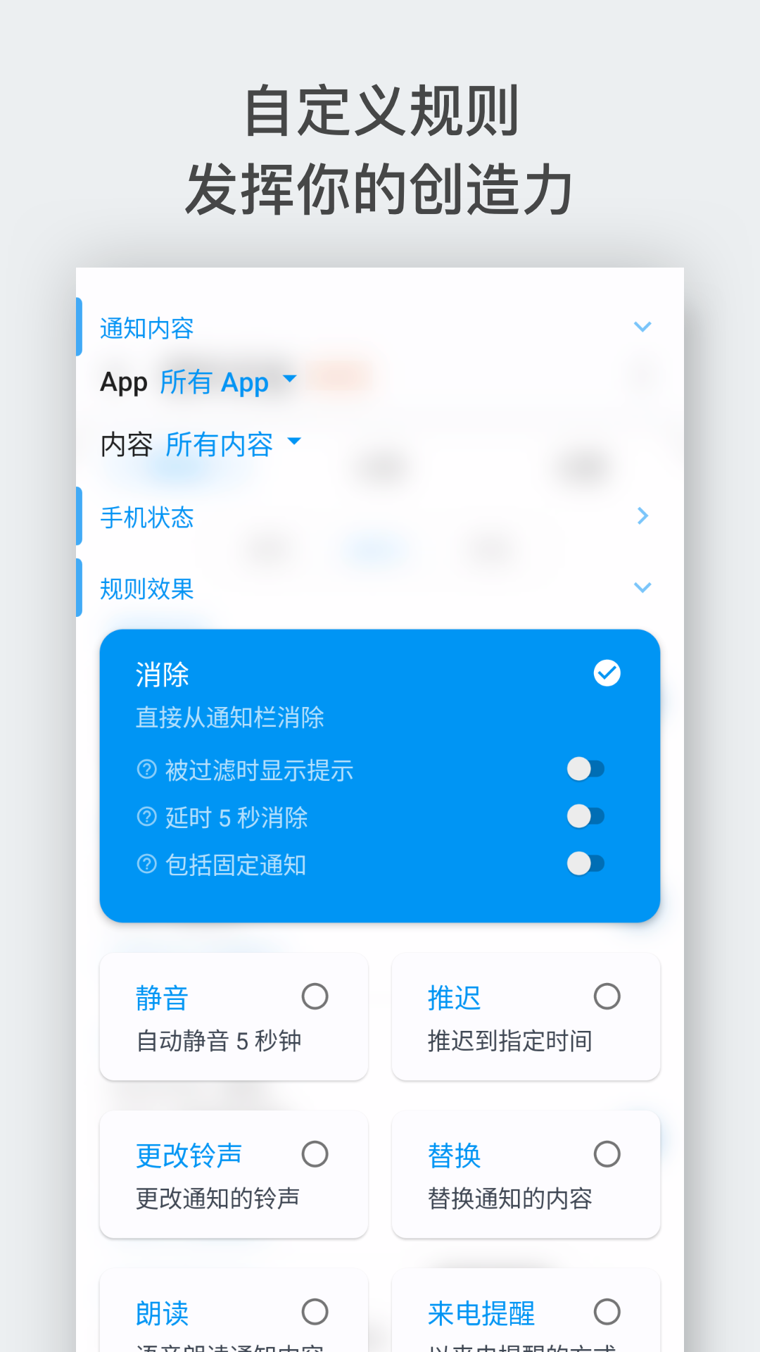 支持用户自定义设置每一个APP的过滤,任何APP都能自己手动设置个性化过滤通知