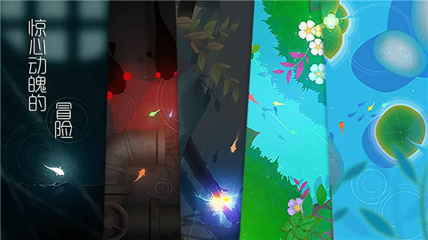 在游戏中,玩家需要引导小鲤鱼寻找同伴,并激活对应颜色的花朵。沿途会遇到各种有趣的生物,如调皮的壁虎、危险的黑色大鱼等。通过解开环境中的谜题,收集散落的拼图碎片,逐步揭开小鲤鱼的身世之谜。